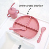 Designed in Canada, this silicone suction plate features a strong suction base and three large divided sections to promote independent eating. Uniquely designed to fit along most highchairs for an easy feeding experience. This feeding set is a great choice for both baby-led weaning and experienced toddlers.